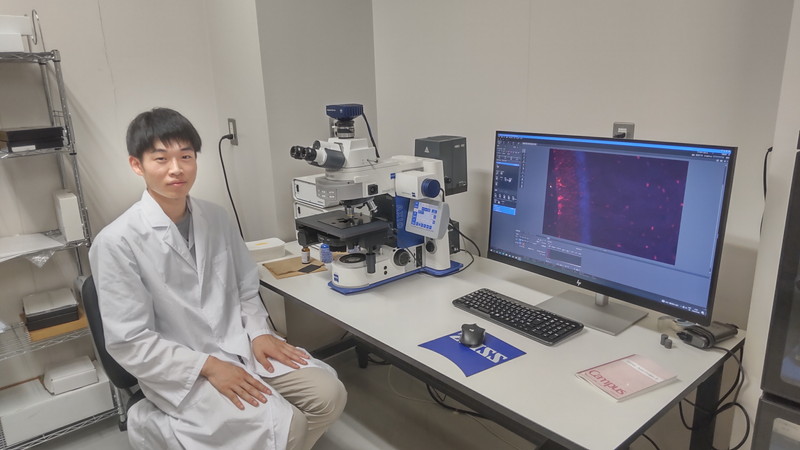 具体的な内容を紹介します。臨床現場を模して3群のマウス(コントロール群、抗がん剤投与マウスと抗がん剤+クレマスチン投与マウス)を作成しました。この3群間に差異が認められれば「おお!」です。差異が無ければ「ええ....」です。配属期間中はこの3群のマウスに対して5つの行動実験と、脳の海馬のスライス切片に含まれるオリゴデンドロサイト、ミクログリアのカウントを行って比較することで差異が認められないか、と睨めっこする毎日です。体感では「ええ....」の方が多くて、その間に複数回の「おお!」があった気がします。これも実験のうちですね。そしてとにかく研究室の方の指導が手厚かった!毎日朝の9時から16時まで、質問すれば必ず答えてくださり、近くで見ていただけました。特に手技が慣れていないうちのマウスの注射、画像解析の手順、免疫染色でお世話になりました。本当に感謝しかありません。ありがとうございました。