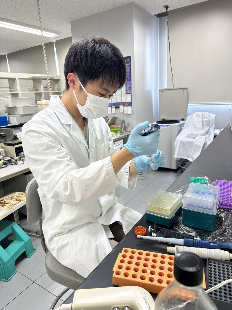 今回の配属では、PCRによる改変した遺伝子のクローニング、電気泳動、DNA抽出やプラスミド抽出、トランスフェクション、蛍光顕微鏡での観察を行いました。実験中は実験ノートを作成して、実験の手順や目的、結果を記録しました。後からノートを見ても実験を再現できるように書くことが実験ノートを書く上で重要だと学びました。そのおかげで、後からノートを見返した際に様々な疑問が浮かび上がり、その疑問について考察することができました。実験の手技については、最初は不慣れな点もありましたが先生の指導をしっかり聞き、丁寧に行うことを心掛けました。その結果、配属期間後半には実験器具を上手く使えるようになり、自分の成長を感じることができました。配属期間中は実験と並行してモルビリウイルスに関する論文を読み進めました。選んだ論文はデータ量が非常に豊富で、データの解釈にかなり時間を要しました。しかし、自分で解釈できないデータは先生と相談することで、データが示す意味を理解することができました。先生からは論文の中のデータ1つ1つに目的があり、そのデータが示す結果が次のデータの目的に関係しているということを意識しながら読むことが重要だと学びました。