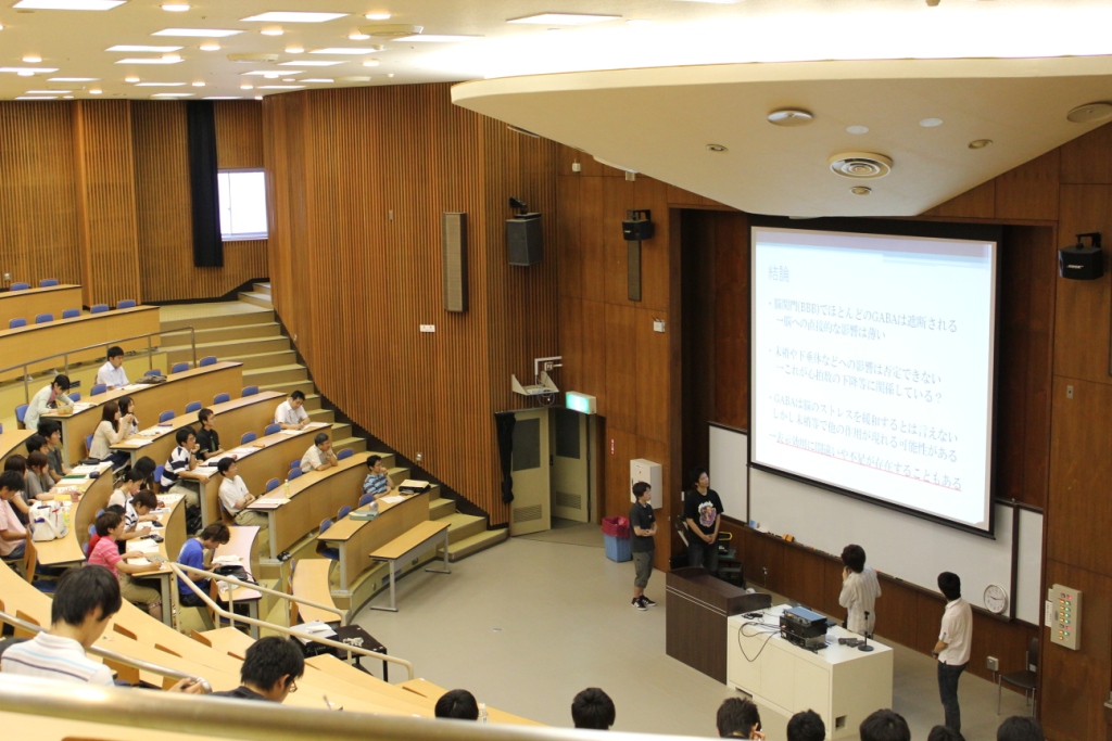 グループにはチューターとして指導教員(原則として担任教授、あるいはその分野の教員)が1名ずつ配置されています。チューターはグループ学習の進め方、調査や発表の仕方などについてアドバイスはしますが、あくまで学生が主体であり、学習のプロセスを計画し、実行するのは学生です。つまり、「学び方を学ぶ」ことが目的であり、どのようなプロセスを経て学ぶのかが重要視された授業です。学習した成果は、最終的に1つのプロダクトとしてまとめ上げ、プレゼンテーション・ソフトウェアを使い、最終日に臨床講堂で行われた学習成果発表会でグループ全員が発表しました(各グループの持ち時間は25分間)。したがって、当日を迎えるまでに、他の人にわかりやすく説明できるまで深く調べ、考え、理解しておくと同時に、発表のスキルも研鑽します。成果発表会では、自分たちが発表するだけではなく、他のグループの発表に対して質問をすることも経験します。