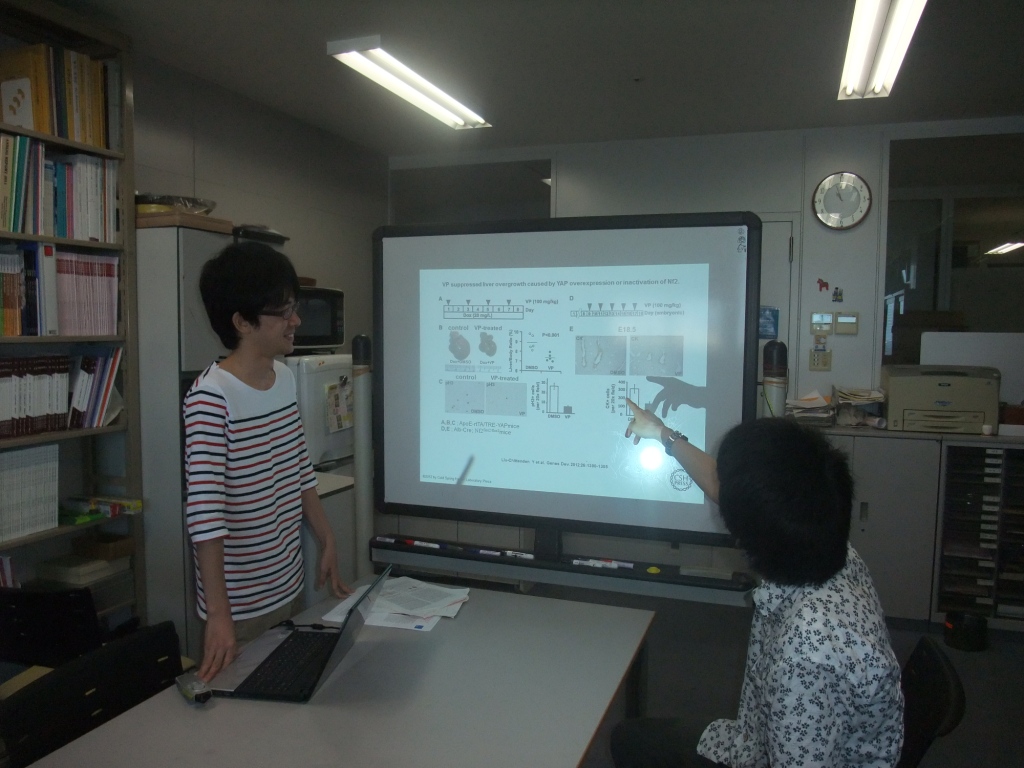 私はこの1ヶ月間、“肝臓におけるMOB1遺伝子の機能解析”をテーマに研究生活を送りました。基本的な濃度希釈の計算から、凍結切片の作成、凍結切片やパラフィン切片における免疫染色、マウスの解剖、そして取り出したマウスの肝臓からのRNAやタンパク質抽出など様々な手法まで、大学院生の森川さんに実験の原理の説明を交えながら丁寧に教えていただきました。実験自体はうまくいくことの方が少なかったですが、1つ1つの実験の意義を考え、教えていただきながら進めていくことはとても面白く、有意義な1ヶ月の配属期間を過ごすことができました。 また、毎週土曜日に行われるjournal clubでは他の研究室の論文に触れ、その論文に対する研究室の方々の様々な意見を聞くことができ、論文の読み方、論文を読む際に注目する点など自分が論文を読む際の参考になることをたくさん得ることができました。配属期間の最終日には、自分で論文を紹介する機会を与えていただいたのですが、教授からの質問になかなか答えることができず、自分の英語力のなさ、論文の読解の甘さを痛感し、今後研究者を目指すにあたって英語力や論文を読む力をつけることも重要だと感じることができました。