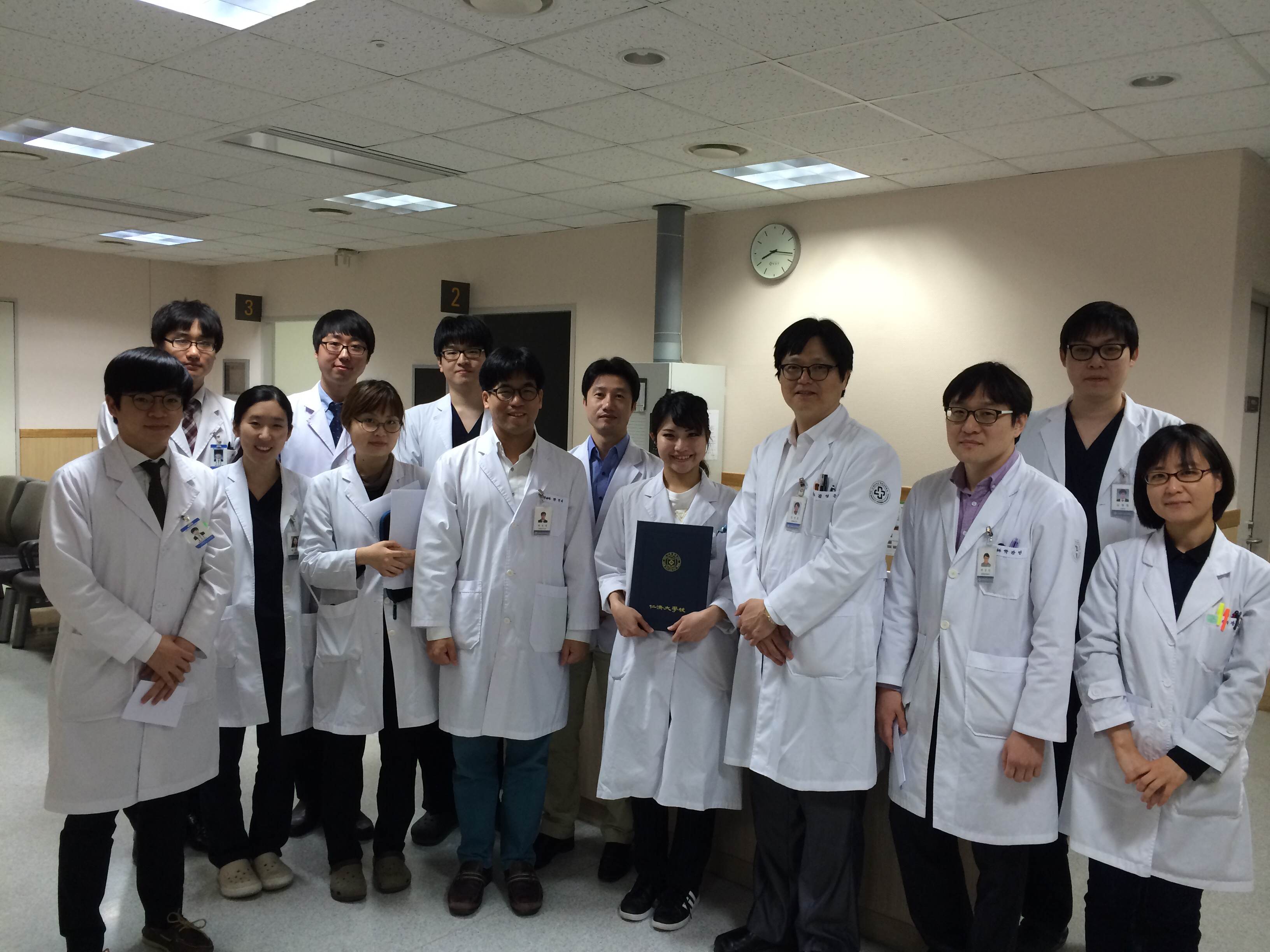 今回私は、インジェ大学海雲台白病院の消化器内科にて、1か月間実習をさせていただきました。この実習ではおもに、毎朝の回診、外来見学、内視鏡検査、エコーの見学をさせていただきました。消化器内科では、基本的にprofessorの文先生の下について行動をするのですが、内視鏡見学ではそのほかのprofessorの先生(あちらではprofessorが複数いらっしゃいます)からもいろいろと勉強させていただきました。