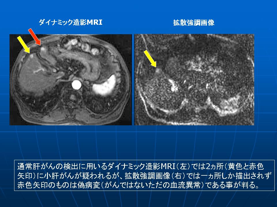このほか、MRI(磁気共鳴画像)で脳梗塞の超急性期の診断に使う拡張強調画像(写真参照)という方法を、腹部腫瘍の診断にも使えるようにメーカーとも共同研究した。もともと細胞の水分子の動きを撮影する方法なので対象が固定していないと難しいが、高速撮影技術を導入した機器の進歩などがあって、リンパ腫、子宮がん、乳がん、前立腺がんなどの診断に採用している。「今後は全身に応用していきたい」(同助教授)と語る。