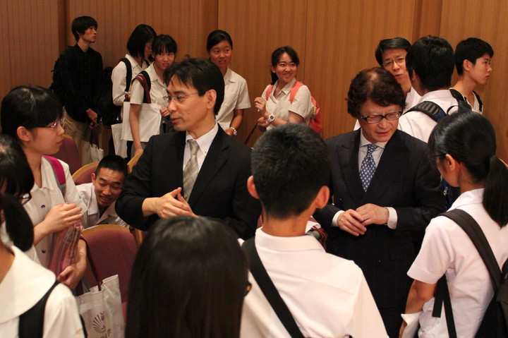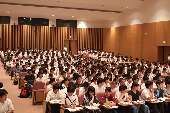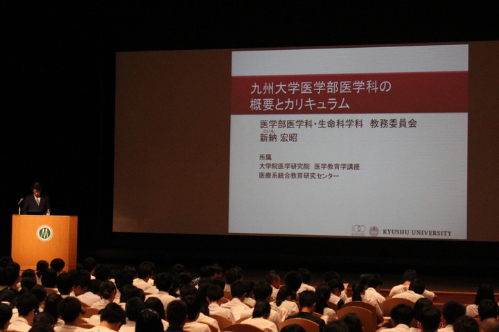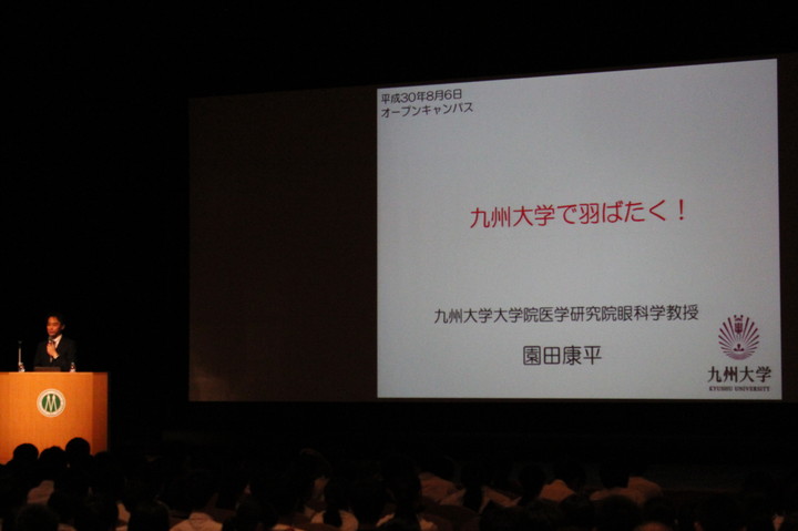 引き続き、医学教育学講座 新納宏昭教授から卒業後の進路や入学後のカリキュラム、MD-PhDコース、九州大学の基幹教育など、本学における多様な教育システムの説明がありました。そして最後に、眼科学分野 園田康平教授の講話「九州大学で羽ばたく!」があり、園田教授は、ハーバード大学での留学経験や、研究を行うことの意義について、眼科医として臨床の場で実際に見てきたことを例にとりながら、分かりやすく説明を行いました。