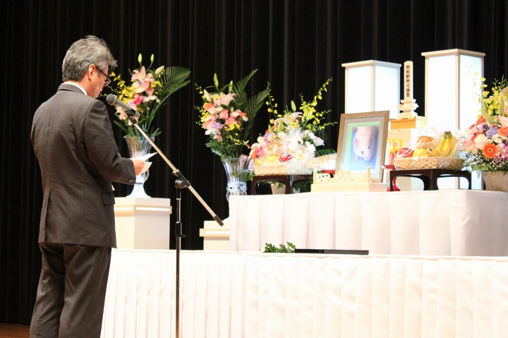 約260名の教職員・学生が参列し、始めに参加者全員で黙祷を行った後、住本研究院長から「慰霊の言葉」が述べられました。引き続き、小野動物実験施設長から弔辞があり、動物実験施設長は「今後とも、動物実験に従事する私達は、国内外の規制の動向や科学的知見に関する情報の収集に努め、3R(代替法の選択、使用数の削減、 苦痛の軽減)と実験動物学の三大統御(環境統御、微生物統御、遺伝統御)を実践することで、 実験動物の福祉の実現と動物実験の再現性確保に取組む所存である。」と述べられました。