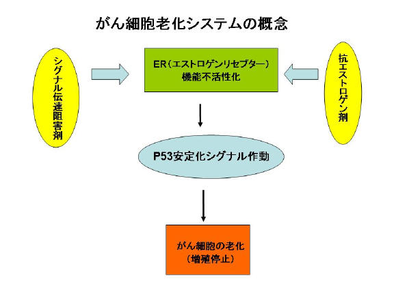 和気教授は、正常細胞に存在する「P53安定化シグナル」という、細胞を老化に導くシステムをがん細胞に再構築して、がんを治療する方法を研究している。これまでの動物実験で、エストロゲンという女性ホルモンの受容体(ER)が活性化されると、がん細胞の不老化が促進されることを、世界に先駆けて明らかにした(参考論文)。次にそのERを逆に不活性化させることで、「P53安定化シグナル」のシステムが、がん細胞に再構築されて、がん細胞を老化に導くことにも成功した。