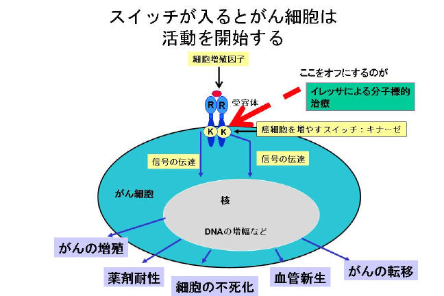 肺がん治療で、分子標的治療薬として開発されたイレッサがある。がん細胞の増殖過程はテレビにたとえるとわかりやすい。電波にあたる「細胞増殖因子」、アンテナにあたる「受容体」、スイッチにあたる「キナーゼ」、ブラウン管に映し出される映像ががんの増殖や転移に相当する。アンテナの下にあるスイッチを切ると映像は消える―つまりがんが消えることが期待される。このスイッテをオフにする薬が、イレッサだ。