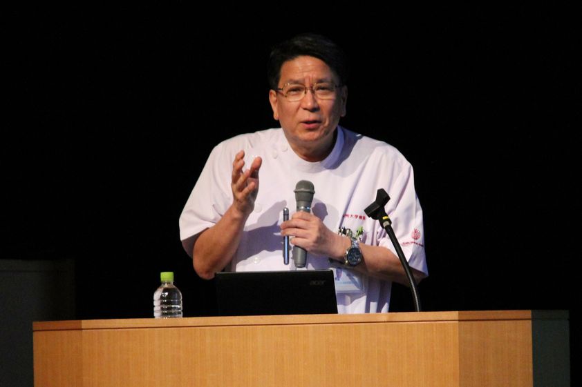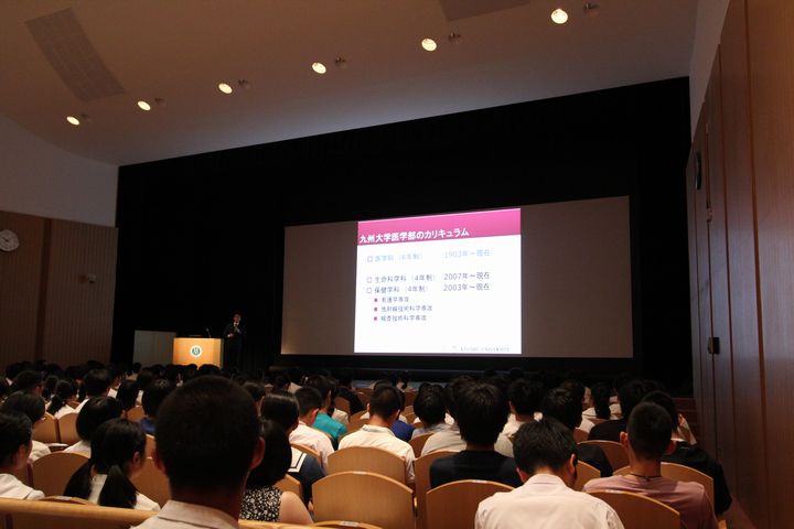 引き続き、医学教育学講座 新納宏昭教授から卒業後の進路や入学後のカリキュラム、MD-PhDコース、九州大学の基幹教育など、本学における多様な教育システムの説明がありました。 そして最後に、成長発達医学分野(小児科) 大賀正一教授の講話「こどもたちの未来を拓く ~医学と医療の進歩から~」があり、大賀教授は、医学部に入学するということ、医師・医学者としての使命・課題、について自らの経験を織り交ぜながら分かりやすい説明を行いました。