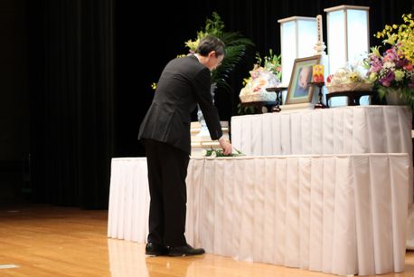 約220名の教職員・学生が参列し、始めに参加者全員で黙祷を行った後、北園研究院長から「慰霊の言葉」が述べられました。引き続き、小野動物実験施設長から弔辞があり、動物実験施設長は「今後とも、動物実験に従事する私達は、国内外の規制の動向や科学的知見に関する情報の収集に努め、3R(代替法の選択、使用数の削減、 苦痛の軽減)と実験動物学の三大統御(環境統御、微生物統御、遺伝統御)を実践することで、 実験動物の福祉の実現と動物実験の再現性確保に取組む所存である。」と述べられました。