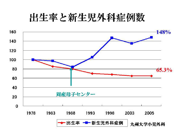 1978年(昭和53年)を100とした出生率と新生児外科症例の比較。九大病院に周産母子センターを設置以来、症例数が急増している。