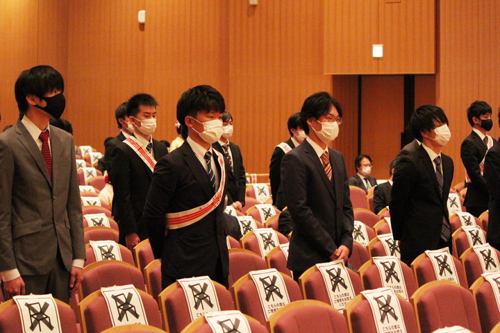 本年度は、新型コロナウイルスの感染が拡大している国内の状況に鑑みて、卒業生・修了生、保護者の皆様が一堂に会しての式典は行わず、出席は各学部の総代12名と大学院総代3名、および事前申し込みによる参加希望者のみに限り、学部の式典は2部制にして開催しました。