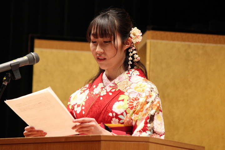 祝辞に対して、医学科を代表して中垣さん、生命科学科を代表して中村さんが本学ならびに本学部に感謝するとともに、九州大学で学んだ多くの事柄をもとに、我が国の将来の医療ならびに医学研究に貢献したいとの決意を述べました。