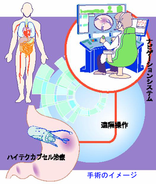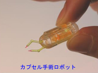 今開発に取り組んでいるのは、飲み込んで手術が出来るカプセルロボット。もちろん完成すれば世界初となる。直径1センチ、長さ2センチの大きさ。この中に鉗子(かんし)を付けた長さ7ミリの腕や、目となる超小型カメラなどを搭載している。医師はモニター画面を見ながら遠隔操作(ナビゲーションシステム)してロボットを胃、小腸、大腸内を動き回らせる。小さな腫瘍は切除して体外に運び出す。ロボットが胃から小さな穴を開けて体内に出て治療することも出来る。まるでSFの世界が、現実になりつつある。患者は傷もなく短時間の手術に、回復が早く入院日数も短くて済む。現在、目と腕の部分が完成している。