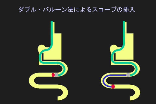 ダブルバルーン内視鏡は、小腸内部を映し出すスコープの部分と、スコープを包みこんでいるオーバーチューブの部分の計2箇所に、バルーンが付いていることからそう呼ばれる。この内視鏡は口からでも肛門からでも挿入できる。2個のバルーンを交代で膨らませたり、しぼませたりしながら、一方を小腸壁に固定させている間に他方を進ませて、シャクトリムシのように進む。途中、小腸内部をモニター画面に映し出して異常がないかをチェックしながら奥へ。ポリープがあれば切除したり、止血したりも出来る。