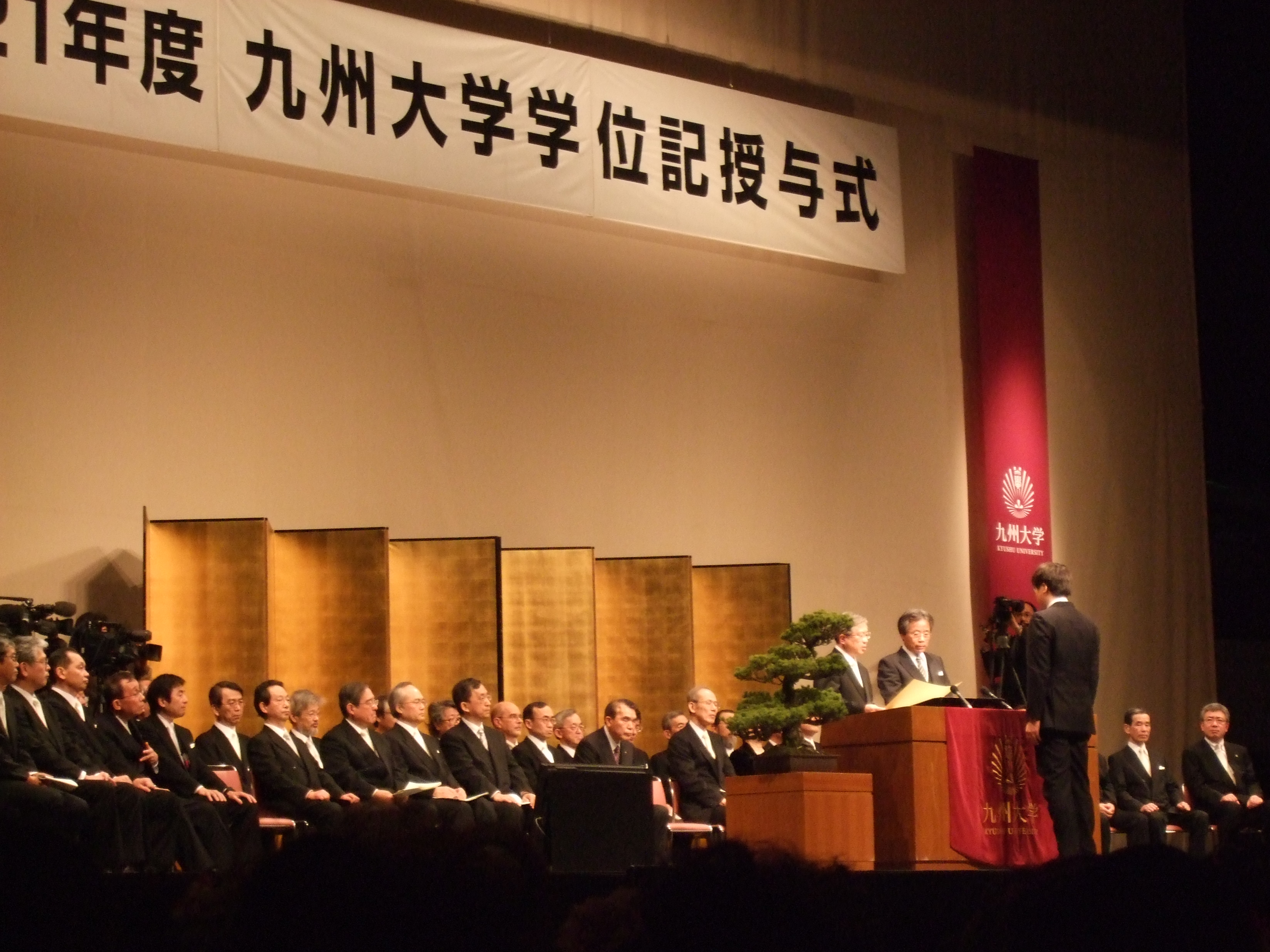 前日来の雨が一時的に上がった花冷えの中、平成22年3月25日(木)9時50分から、福岡国際センターにおいて平成21年度学位記授与式が行われました。