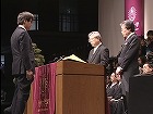 式典に先立って九大フィルハーモニーオーケストラによるシベリウス作曲「フインランディア」の祝賀演奏があり、他学部の学生達と一緒に、医学部医学科卒業生106(内:女子12)名の門出を祝いました。高柳医学部長による課程修了の認定を受けて、有川総長から医学部総代の清水寿顕君に学位記が授与されました。清水君は同時に今年度の成績優秀者の表彰も受けました。式の最後には、九州大学混声合唱団のリードで卒業生全員による学生歌「松原に」の斉唱がありました。