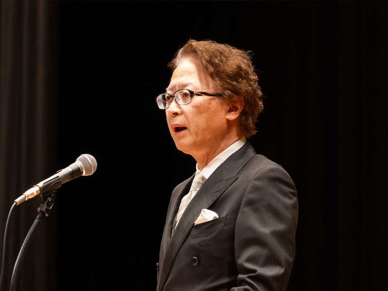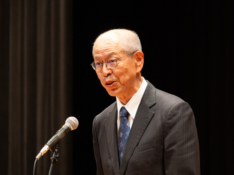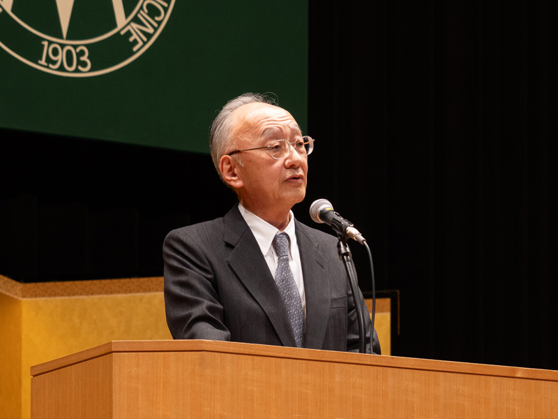 続いて、須藤医学部長、新納生命科学科長、外医学部同窓会長、そして中村九州大学病院長がそれぞれ祝辞を述べました。須藤医学部長の祝辞では、病院キャンパス内の通りの名前の由来となった医学部の先生方とその功績が紹介され、本学で培ったあらゆることを忘れず、諸先生方と肩を並べられるよう、誇りを持ってそれぞれの道に邁進してほしいという激励の言葉が贈られました。