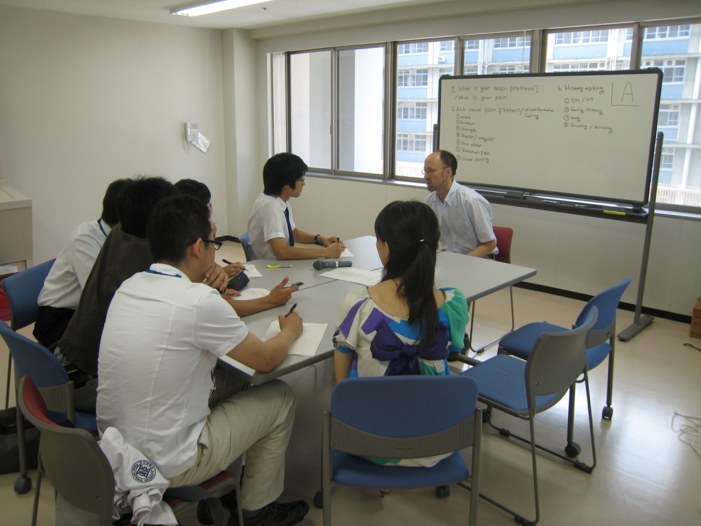 第4日目は、外国人の模擬患者の方に対しての『英語による臨床(診療)実習』を今回初めて行いました。学生は最初戸惑っている様子でしたが、模擬患者の方に診療時の患者さんとの接し方(表情や言葉遣い)について熱心に質問するなどし、予定した時間を大幅に延長することになりました。