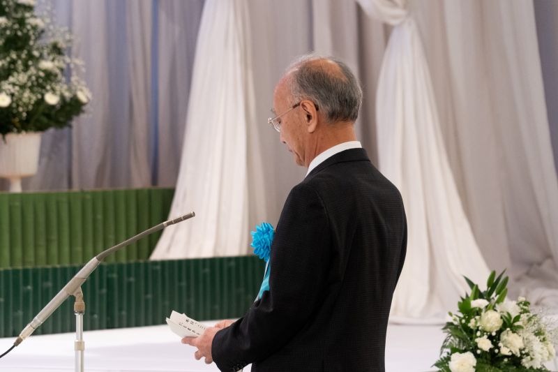 はじめに医、歯学部の学生代表の献灯(医学部 轟木 豪人さん・歯学部 勝田 隼人さん)と献花 (医学部 八波 りおさん・歯学部 田野 優月さん) が行われ、開式の辞の後、過去1年間の篤志献体者の芳名簿が、教員を代表して医学部解剖学担当の神野尚三教授より祭壇に奉納され、参列者全員で黙祷を行いました。続いて、須藤 信行医学部長、西村 英紀歯学部長、林 純白菊会理事長が追悼の辞を述べ、医・歯学部の学生を代表して、医学部 梶山 翔吾さんが慰霊のことばを述べました。