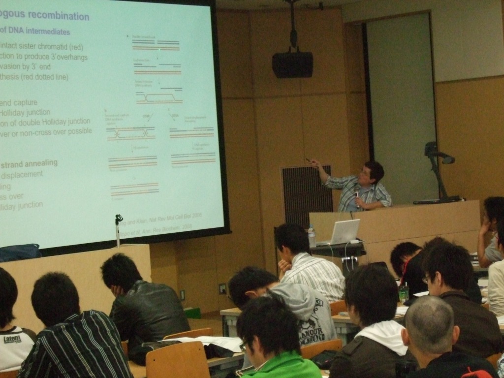 4月14日(月)の2時間目の「生化学」の講義枠で、本年度の日本学術振興会外国人研究者招へい(短期)プログラムで九州大学医学部訪問教授として来日中のカナダのカルガリー大学医学部教授のSusan P. Lees-Miller 博士に、「DNA damage and DNA repair」と題した講義をお願いしました。2年生の皆さんにとっては初めての英語による専門基礎科目の講義だったとは思いますが、幾つかの良い質問も飛び出し、多いに刺激的な機会であったと思われます。これをきっかけに学生達には、英語学習の必要性を認識して取組んで欲しいと希望しています。