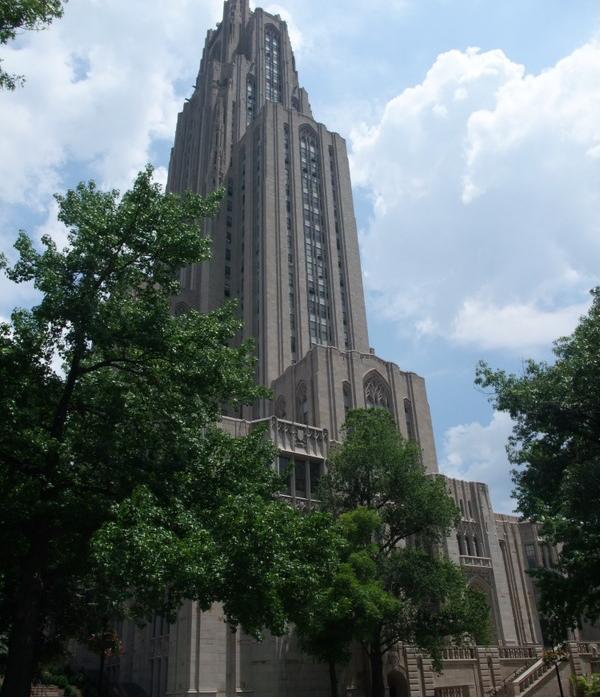 〈写真説明〉1. 42階建て、高さ160mのゴチック建築「学びの聖堂」は、教育機関としては全米1(世界2位)の高さを誇るピッツバーグ大のシンボル。「アメリカの技術力、資源力、歴史の重みに感動した」と吉田さん。2.自宅のアパート屋上で、アメリカ、コロンビア、ブラジル出身の同僚家族とパーティー。(左から2人目が吉田さん)