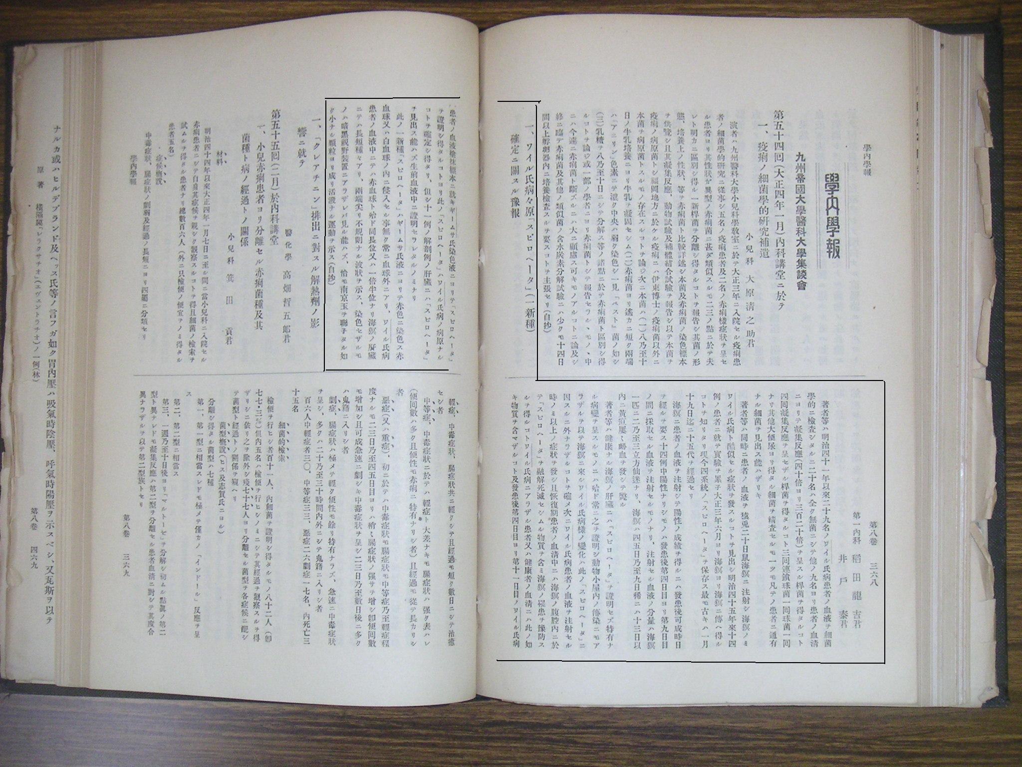 〈写真説明〉・稲田博士がワイル氏病病原体発見の第一報を大学集談会で発表、その内容を掲載した福岡医科大学雑誌第8巻4号(黒枠の部分)。
