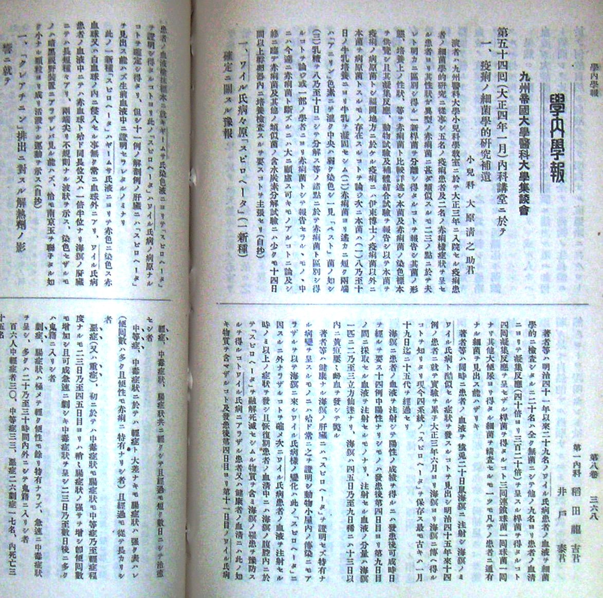 かつては、世界的な研究も多く発表された。ワイル氏病の病原体を世界で初めて発見した稲田龍吉博士が、その第一報を第54回九州帝国大学医科大学集談会(大正4年1月)で「ワイル氏病病原スピロヘ-タ(一新種)確定に関する予報」として発表した内容が、同医科大学雑誌第8巻4号(大正4年4月)に掲載されている。その論文発表は同年2月の東京医事新誌であったが、同8巻5号(同年6月)には原著「日本黄疸出血性スピロヘータ病(ワイル氏病等)の研究概要」も掲載されている。博士はこの研究で学士院賞を授与され、ノーベル賞候補にもなった。