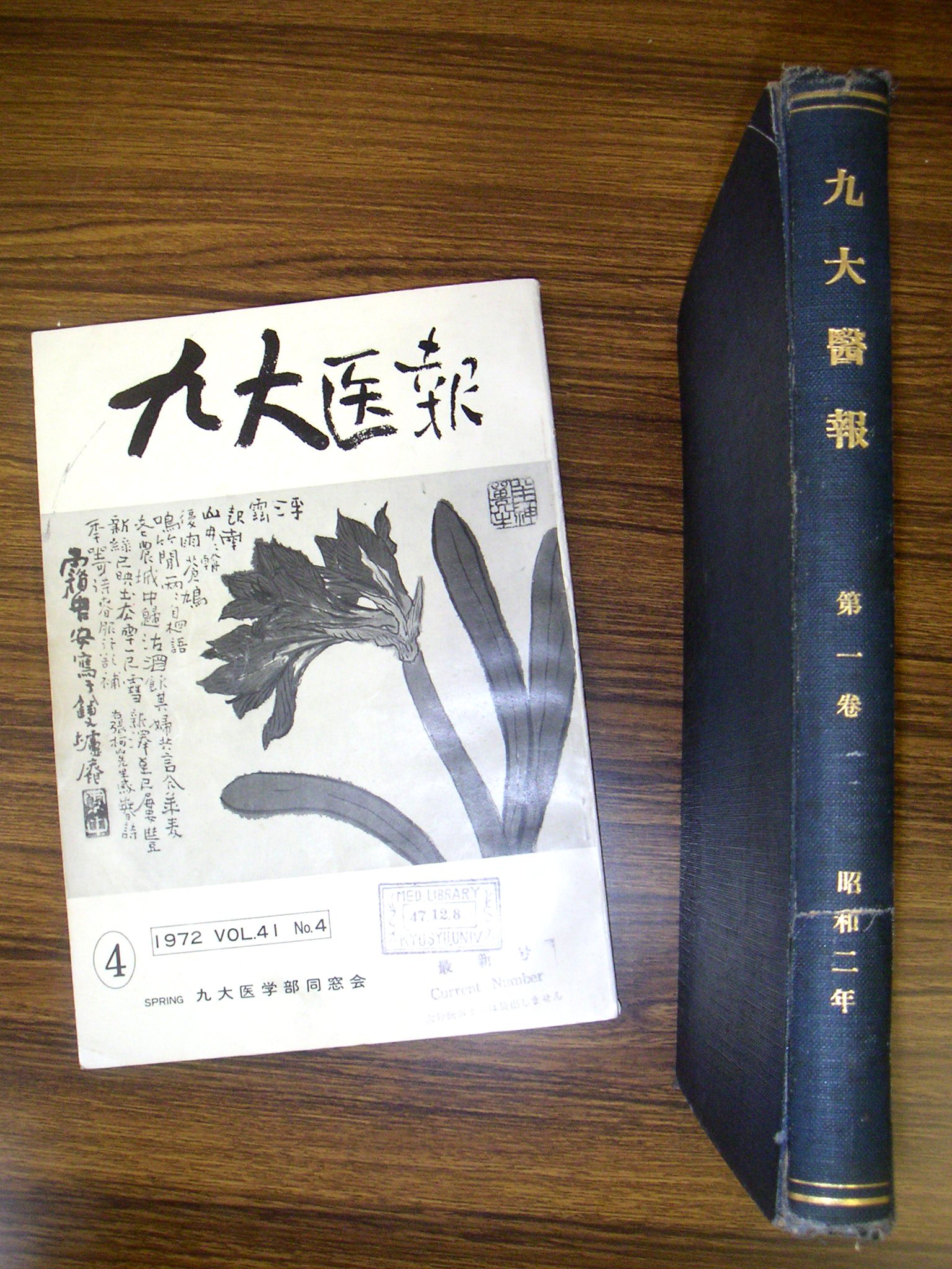 〈写真説明〉九大医報第1巻(黒表紙)と、同窓会誌として最後になった同41巻4号(左)。