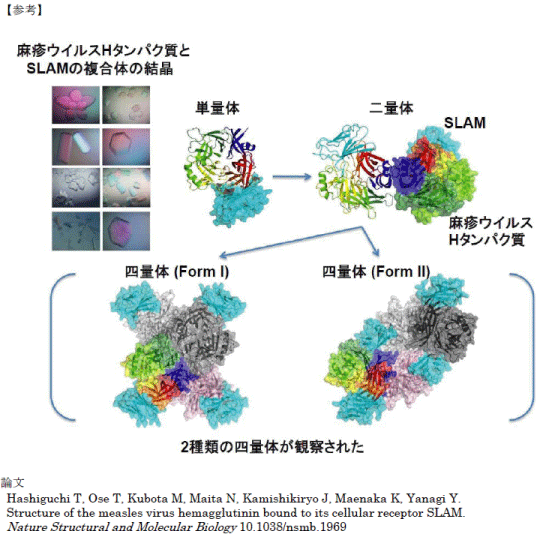 さらに、今回の研究で、H タンパク質は2 種類の四量体(4 個の同一分子が集合したもの)構造をとることが明らかになりました。麻疹ウイルスはパラミクソウイルスというグループに含まれますが、このグループのウイルスがどのようにして膜融合を起こして細胞に侵入するかは長い間不明でした。柳教授らの研究から、ウイルスが受容体に結合することにより、H タンパク質の四量体構造に変化が起こることが膜融合の引き金になることが強く示唆されました。