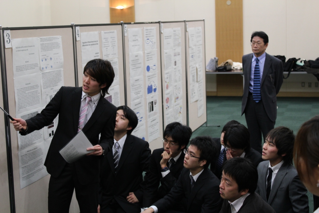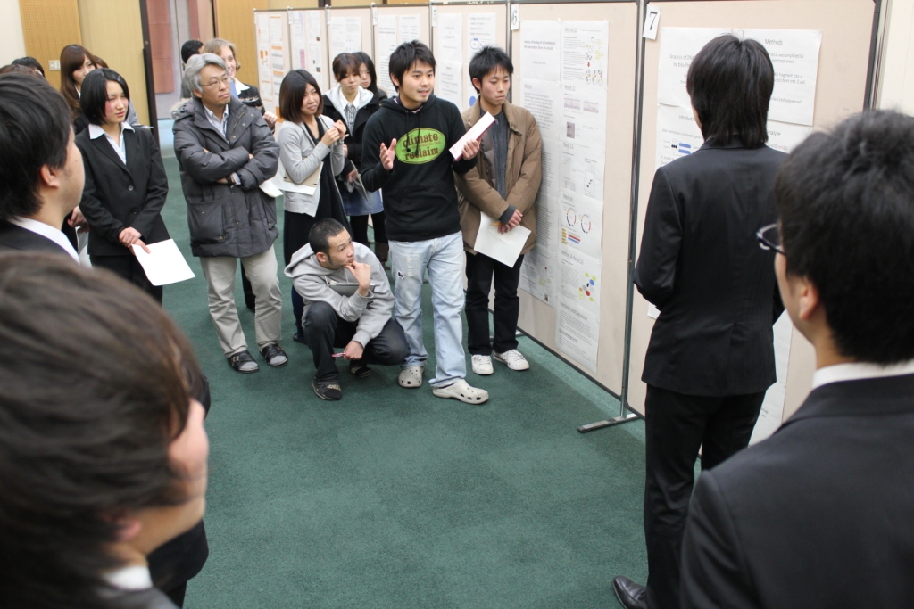 生命科学科3年生14名による英語によるポスター発表が2011年2月4日午後に百年講堂で行なわれました。発表内容は第3学年前期に設定された「早期研究室体験実習」での体験・成果を基に、論文に繋がる英文レポートを作成し、ポスターとしてまとめたものです。この模擬国際会議ポスター発表(Mock International Conference Poster Presentations)はタイトルから内容まで学生自身が工夫して作成したものです。