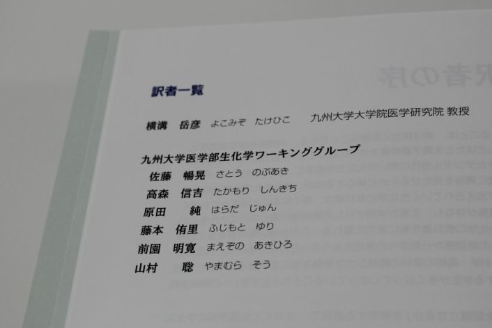 この問題集の翻訳にあたっては、医学科6年生の6名が「九州大学医学部生化学ワーキンググループ」として下訳の翻訳を行いました。訳者一覧に6名全員の名前が記されており、在学中の学生の名が記された本が出版されるのは異例のことです。今回は監修をされた医化学分野 横溝岳彦教授と生化学ワーキンググループの前園明寛さん、山村聡さん、高森信吉さん、藤本侑里さん、佐藤暢晃さん、原田純さんにお話を伺いました。