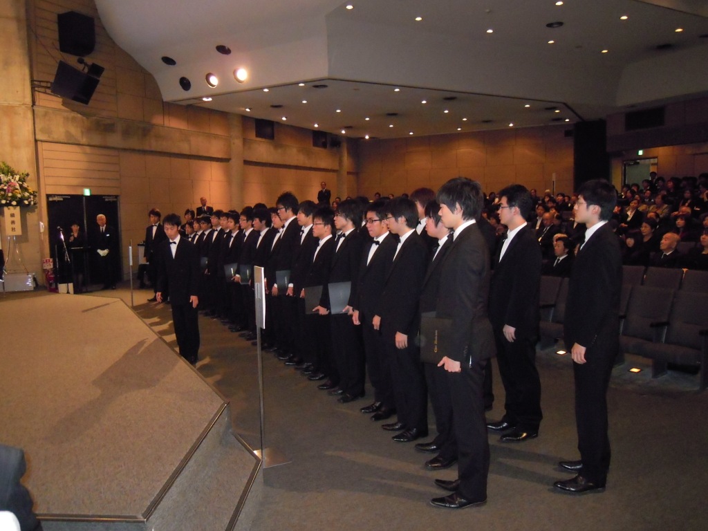 男女学生4人による献灯・献花に始まり、過去1年間の篤志献体者の芳名簿が祭壇に奉納されました。黙祷のあと片野光男医学部長、坂井英隆歯学部長代理、梶原壌二九大白菊会理事長がそれぞれ追悼の辞を述べ、学生代表の慰霊のことば、九大コールアカデミー(男声合唱団)による鎮魂歌と続き、それぞれに御霊と遺族への限りない感謝の気持ちにあふれていました。