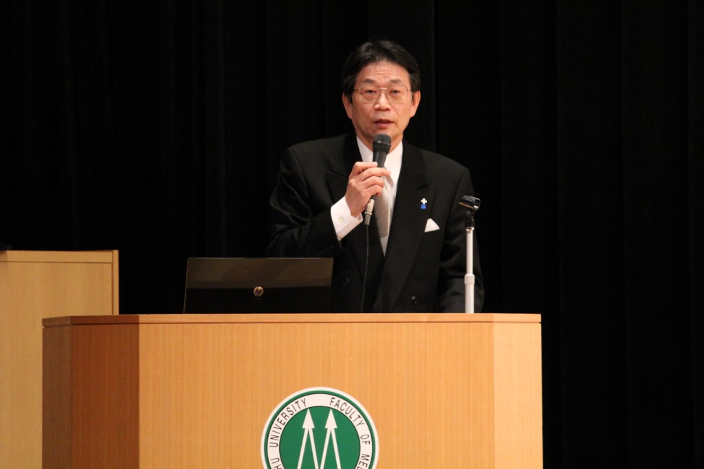 片野光男医学部長は、挨拶で「毎日、志を高く持って身を整え敬いを持って、医系キャンパスの門をくぐってきて欲しい。われわれ教員は皆さんの志を高くするための助力を惜しみません。皆さんは我々教員を信じて、社会貢献をし得る人に成長することに邁進し、人から与えれることに満足せずに、自分自身が社会に貢献しうるものを作り上げることを目標の一つにして欲しい。」という新入生へのお祝いのメッセージを贈りました。