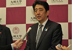 就任後初めて九州入りされた安倍首相は,先端医療の現場視察として九州大学病院を訪問され,有川総長,久保病院長,片野医学研究院長等の挨拶を受けられた後,本学教員から研究概要の説明を受けられました。