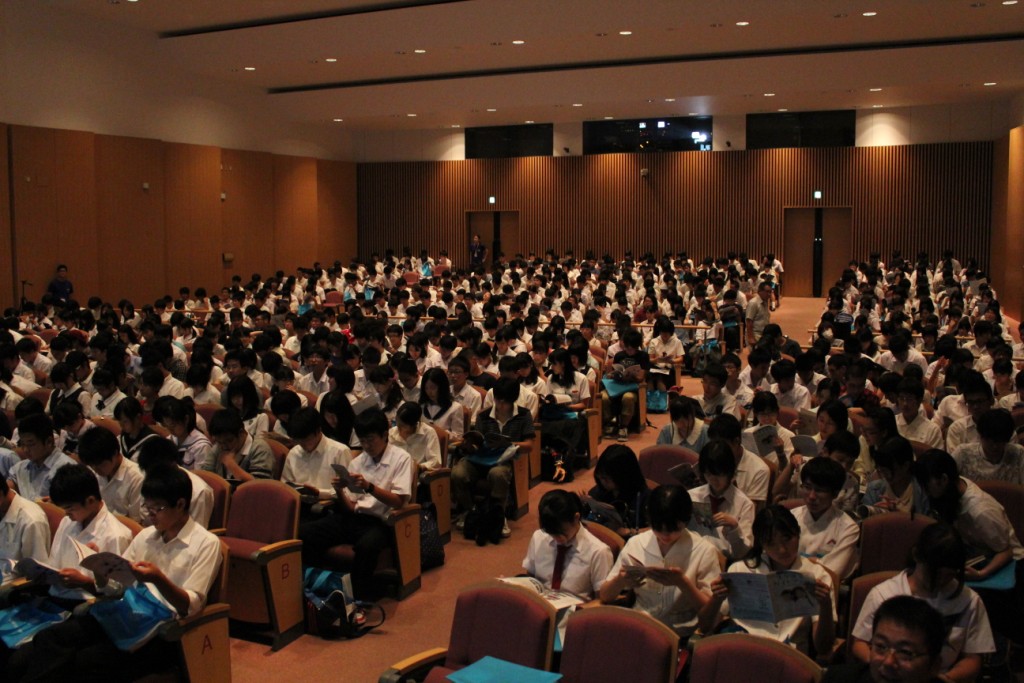 例年のように医学科の説明会場として、570名を収容できる百年講堂大ホールを準備していましたが、収容定員を大幅に上回る約1,250名の高校生とそのご家族に来学して頂いたため、急遽、中ホールも開放し、中ホールではテレビ中継を使用しての開催となりました。