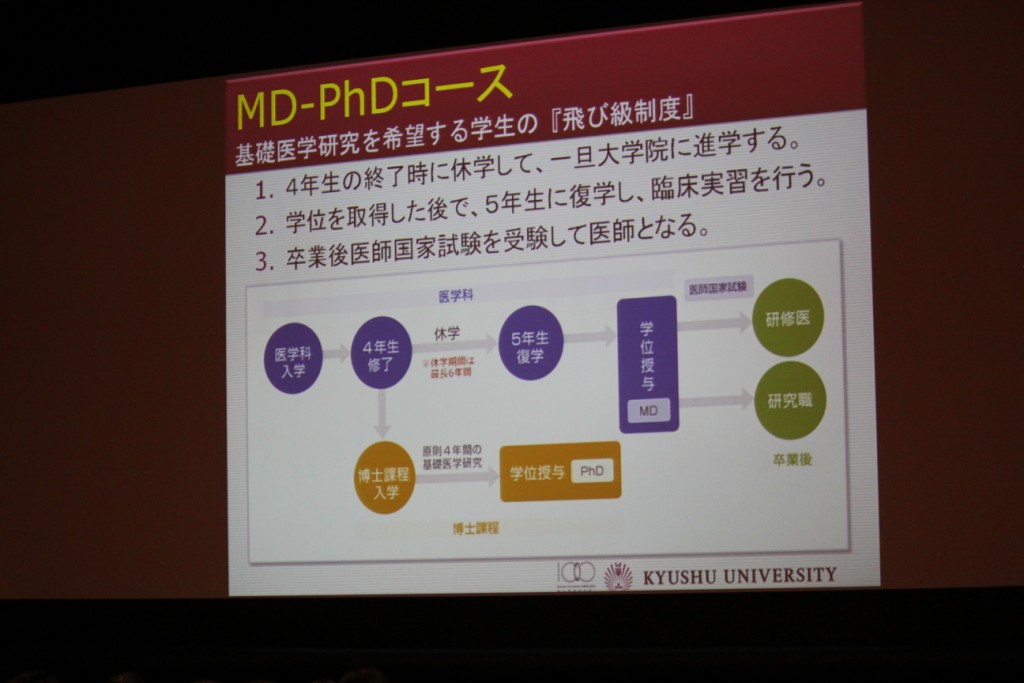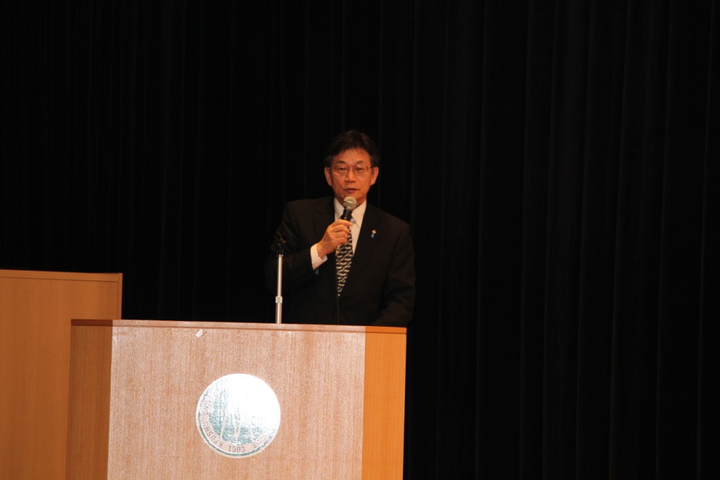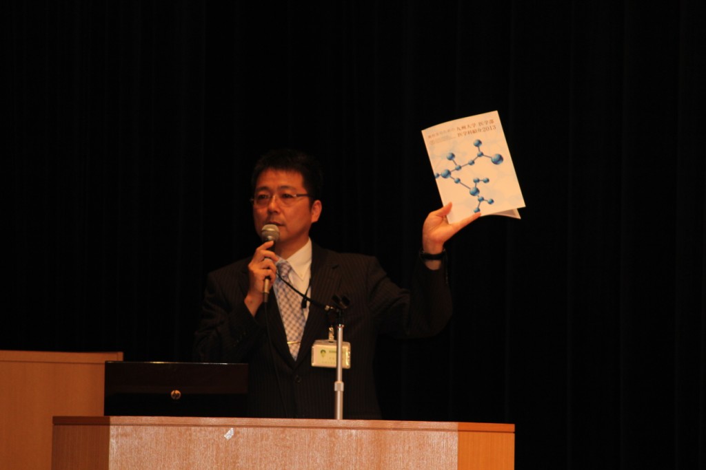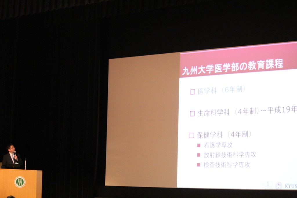 片野光男医学部長は挨拶で、現在、病院キャンパス内に計画中である産学官連携ゾーンの紹介をし、九州大学医学部が国際的に開かれた医療・医学イノベーションの拠点となる目標を持っていることを紹介されました。そして、「この病院キャンパスは病院を中心に医、歯、薬、保健、そして先端の研究施設がある、他に例を見ない充実したキャンパスです。是非、大きな夢と目標を持って医学部の門をくぐってきて欲しい。」と示されました。また、本年、本学が主幹校を務める西日本医科学生体育大会についても紹介されました。