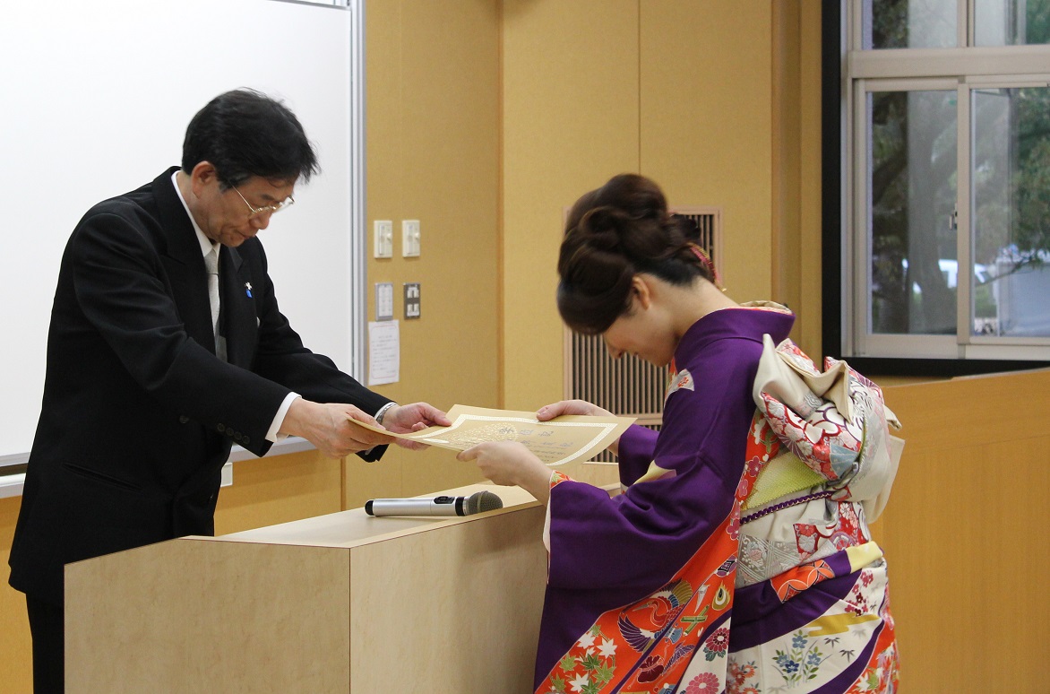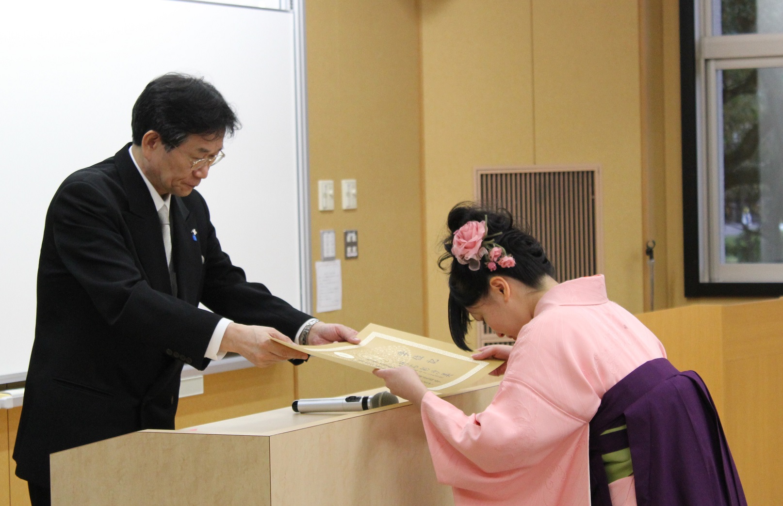 ![]() 学位記授与 生命科学科代表 山下 実さん |