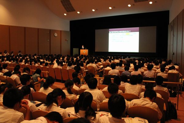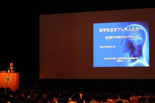 引き続き、医学教育学 吉田素文教授からは、入学後のカリキュラムや、MD-PhDコース、九州大学の基幹教育についてなど、本学における多様な教育システムの説明がありました。最後に、脳神経外科学分野 飯原弘二教授の講話「医学を目指すプレ大人たちへ」がありました。飯原教授は、医師がどのようにスキルを身につけていくのかを、ご自身の留学等の経験の話を例にとり紹介されました。参加者は説明会を通して医学の知識に触れ、新たな刺激となったようでした。