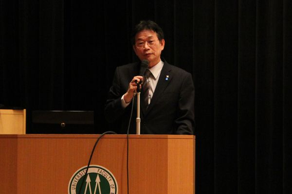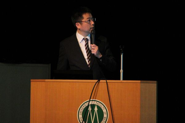 片野光男医学部長は挨拶で、「医学部は6年制の医学科の他、将来医学研究者を目指す4年制の生命科学科、そして保健学科からなり、多様な人材と学問やあるいは部活等をとおして交流することが出来る。この病院キャンパスは病院を中心に医、歯、薬、保健、そして先端の研究施設がある他に例を見ない充実したキャンパスであり、医療、医学、生命科学について幅広くかつ深く学ぶことができる。自分が将来、医療・医学研究をとおして社会に貢献していきたいと志す人は、是非迷わずこの九州大学医学部の門を叩いて欲しい。」と示されました。