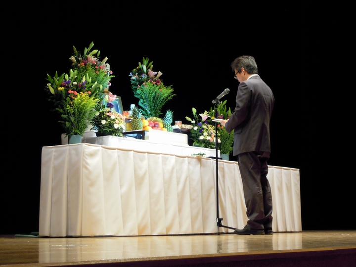 約300名の教職員・学生が参列し、始めに参加者全員で黙祷を行った後、片野研究院長から「慰霊の言葉」が述べられました。引き続き、小野動物実験施設長から弔辞があり、動物実験施設長は「今後とも、動物実験に従事する私達は、国内外の規制の動向や科学的知見に関する情報の収集に努め、3R(代替法の選択、使用数の削減、苦痛の軽減)を実行し、実験動物の福祉の実現に取組む所存である。」と述べられました。