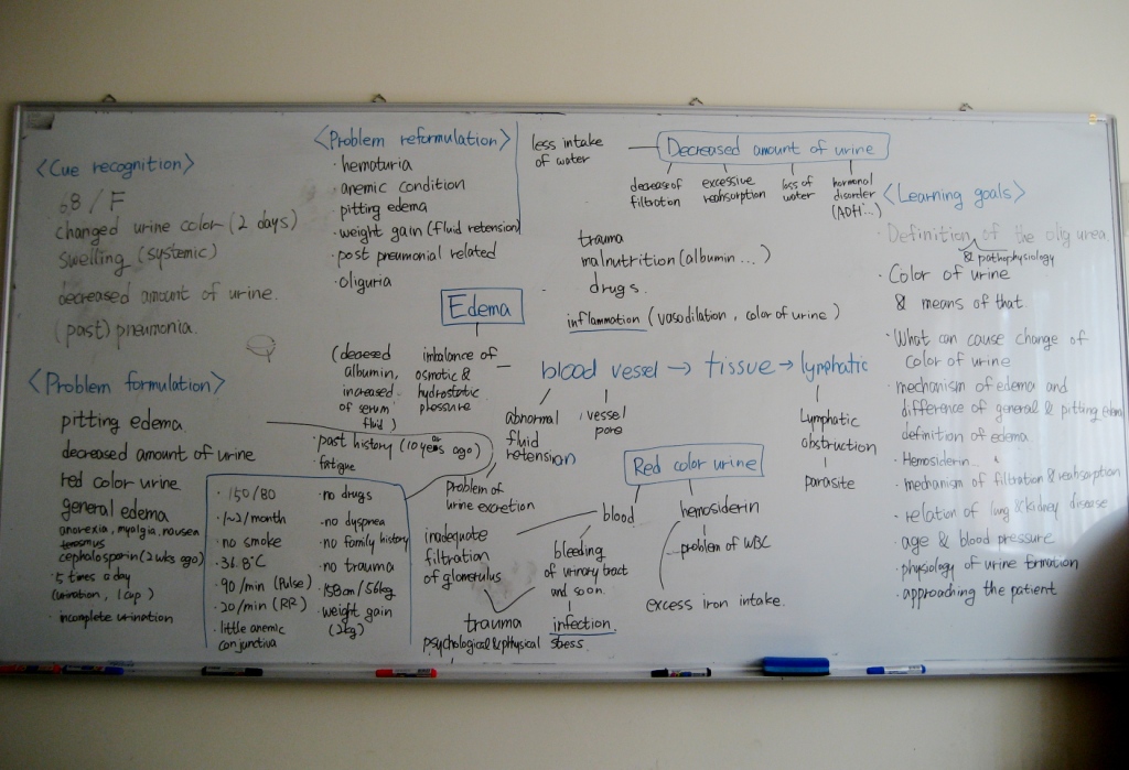 今年3月のPBLには九大から医学部2、3年生7人が参加した。2,3人ずつが仁済大の学生数人とグループを組み、授業は英語。各グループの共通テーマは「腎臓」で、あるグループでは「肺炎患者に血尿症状が見られる。どう診断するか」が課題だった。進行役とホワイトボード記載担当の学生が選ばれる。症状から考えられるいくつかの病気の仮説を立て、検査データとして何が必要か、全員で討議しながらパソコンから取り出せる検査データを検討していく。学生が求めてこないデータは判断上必要であっても、最後までチューターは教えない。チューターの参加しない午後は学生同士で議論し、議論の過程で出る問題点を分担して調べて次回発表し合う。これを隔日3日間行い、最終日にカルテがチューターから示され、「IgA腎症」という診断結果を導き出すことができた。