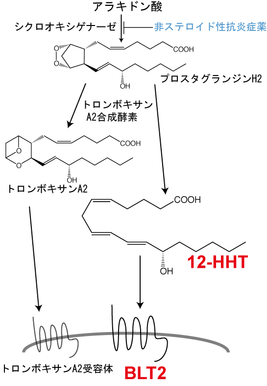 <図の説明> 細胞膜を構成する脂質に存在するアラキドン酸からプロスタグランジンH2を経て12-HHTとトロンボキサンA2が産生され、別々の受容体を活性化する。