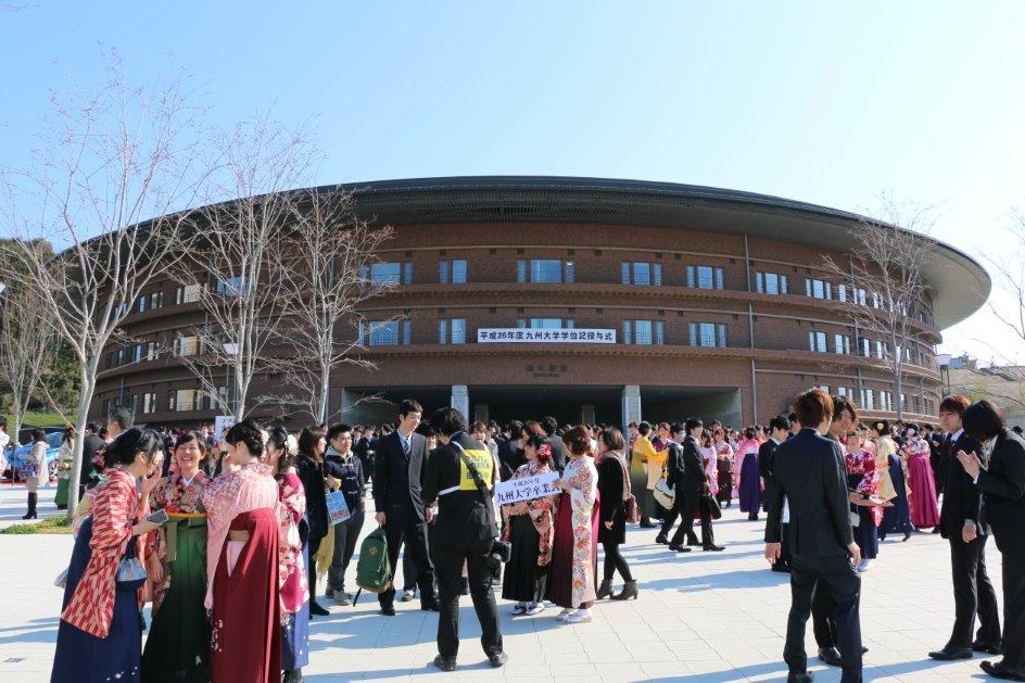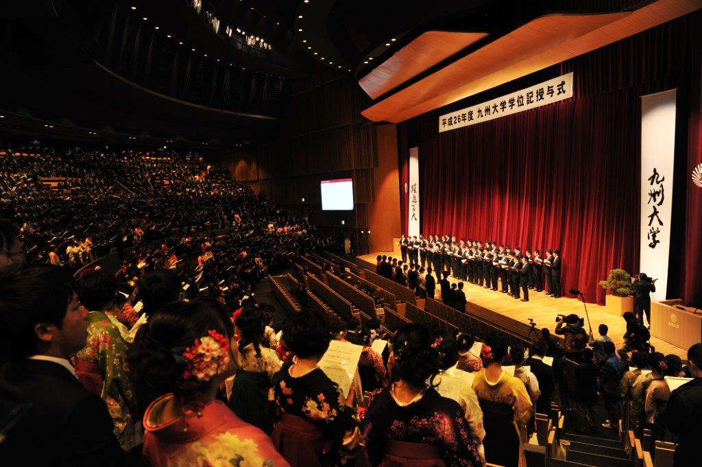 久保総長は告辞において、『皆さんが本学で学んだことを生かし,夢を持って今後の未来を切り開いて大きく飛躍し,グローバル社会を力強く牽引するリーダーとして大成されることを期待します。』と述べられました。その後、卒業生を代表して工学部の蓑田剛志(みのだ たけし)さんが『九州大学卒業生としての誇りを胸に,これからも謙虚な気持ちで日々精進し,社会に貢献していきます。』と答辞を述べました。