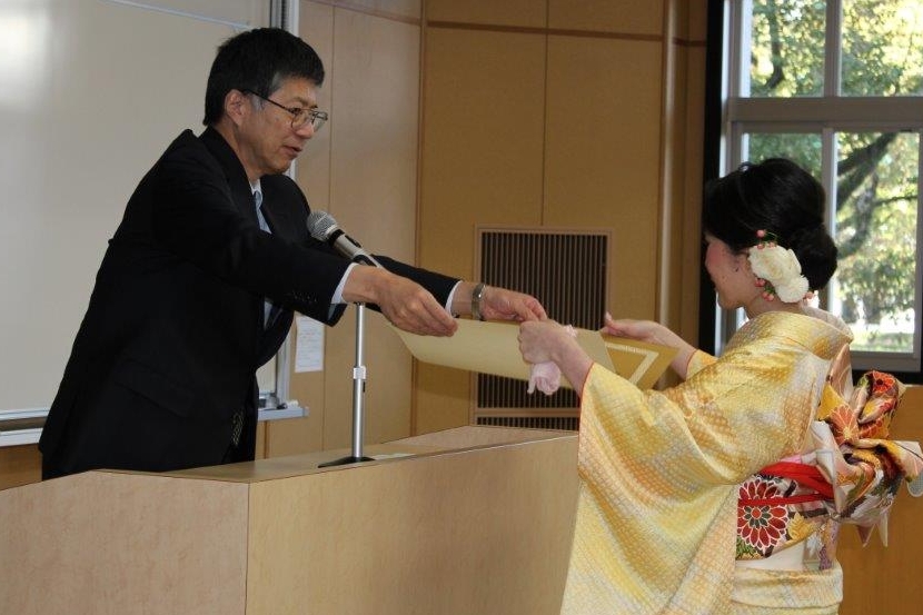 医科学専攻修士課程および医学専攻博士課程の学位授与式は、病院キャンパス内基礎研究A棟で行われ、医科学修士19名、医学博士50名に学位が授与され、出席者一人一人に住本学府長から学位記が手渡されました。