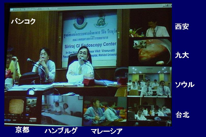 2007年8月。場所は中国西安市内のホテル。会場の大きなスクリーンには、二つの内視鏡検査の場面が映し出された。一つは九大病院からの胃、もう一つは京都第二赤十字病院からの胆道の内部だ。同時にマヒドン大学シリラ病院(タイ)、マラヤ大学(マレーシア)、台湾大学病院、漢陽大学(韓国)、ハンブルグ大学(ドイツ)にも送られた。翌日は高麗大学(韓国)病院の大腸手術場面が西安会場のほかに、フィリピン大学、タタ記念病院(インド)シンガポール大学、東京医科歯科大、ボルドー大学(フランス)にも送られた。西安会場には、受像した各国会場の様子も映し出され、盛んに討論が行われた。今回注目を集めたのは、アジアからヨーロッパ2か所に初めて遠隔医療映像が送られたことである。