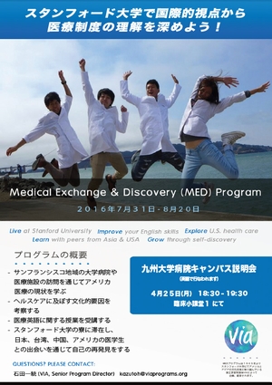 | 独立非営利団体VIAによるMedical Exchange& Discovery(MED)Program(2016.7.31-8.20実施)の説明会が、4月25日(月)に病院キャンパスにて開催されます。 詳細は右のポスターをご確認ください。 |