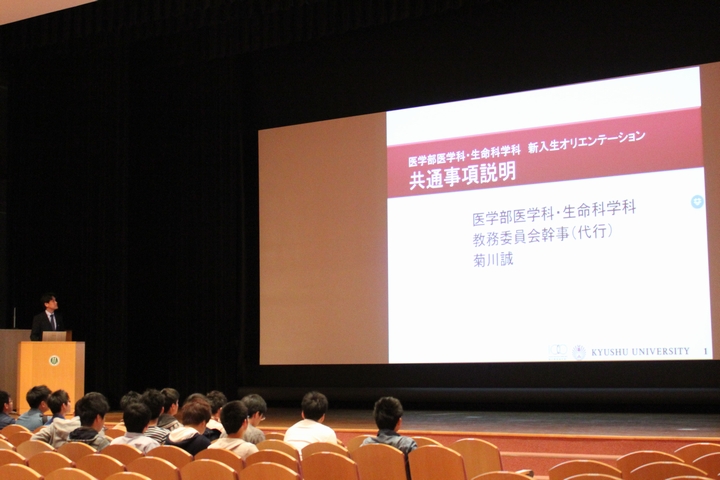 学部長挨拶の後、教務委員会幹事代行 菊川誠講師(医学教育学講座)から医学科、生命科学科の専攻教育科目共通事項について説明があり、その後、医学科、生命科学科に分かれ、それぞれの履修解説が行われました。