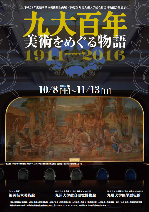 | 福岡県立美術館および九州大学総合研究博物館の主催による「九大百年 美術をめぐる物語」が平成28年10月8日(土)~11月13日(日)の期間で開催されます。 九州大学はその百余年の歴史の中、様々な分野で福岡県の地域文化や社会との関わりを持ち、美術分野でも地域文化の振興に、直接的にまた間接的に貢献してきました。この展示は、九州大学の公私にわたる「美術」を中心にした視覚文化における活動を通し、九大百年の歩みと福岡の地域文化の振興に果たした役割を振り返るものとなっています。 福岡県立美術館をメイン会場とし、箱崎キャンパスの九州大学総合研究博物館、病院キャンパスの九州大学医学歴史館もサテライト会場として開催され、医学歴史館では新島伊三郎制作のムラージュの展示を行います。 詳細は右のポスターでご確認頂けます。皆様のご来場をお待ち申し上げます。 ■福岡県立美術館 (http://fukuoka-kenbi.jp/) ■九州大学総合研究博物館 (http://www.museum.kyushu-u.ac.jp/) ■九州大学医学歴史館 (http://rekishikan.med.kyushu-u.ac.jp/) |