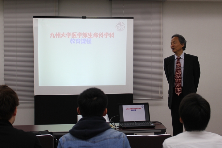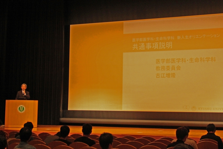 学部長挨拶の後、前年度教務委員長 古江増隆教授(皮膚科学分野)から医学科、生命科学科の専攻教育科目共通事項について説明があり、その後、医学科、生命科学科に分かれ、それぞれの履修解説が行われました。