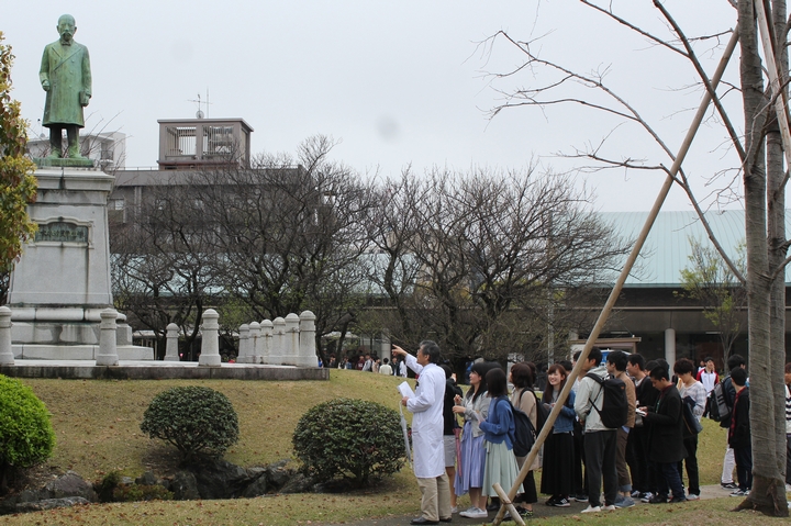 履修解説の後は、再び大ホールにおいて、医学学生係長から医学部在学中の注意事項等が、医学部同窓会から同窓会についての紹介があり、その後、病院キャンパス見学ツアーが催され、グループに分かれ実際にキャンパス内を歩き、教員からキャンパス内の歴史的名所や施設についての説明を受けました。