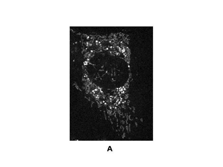 <写真説明>ヒトのHeLa細胞の蛍光顕微鏡写真。A:ミトコンドリアDNAの蛍光染色。薄く白い糸状に見えるのはミトコンドリア。その中で濃く白い顆粒状に見えるのがミトコンドリアDNA。核は抜けて見えている。B:活性酸素の蛍光染色。丸く抜けて見えるのは細胞の核。核周囲に緑に光っているのが活性酸素。活性酸素が主にミトコンドリアで発生していることを示している。